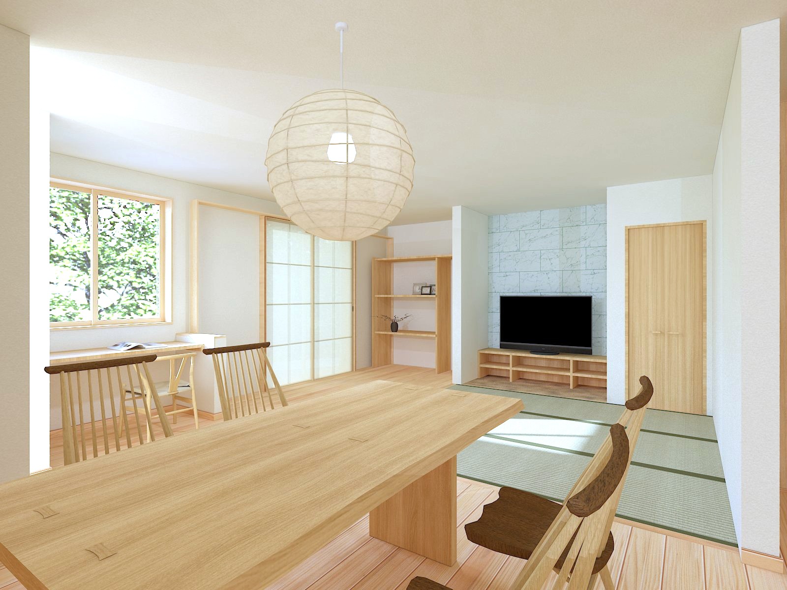 リビングの大開口には障子戸を、テレビ背面には