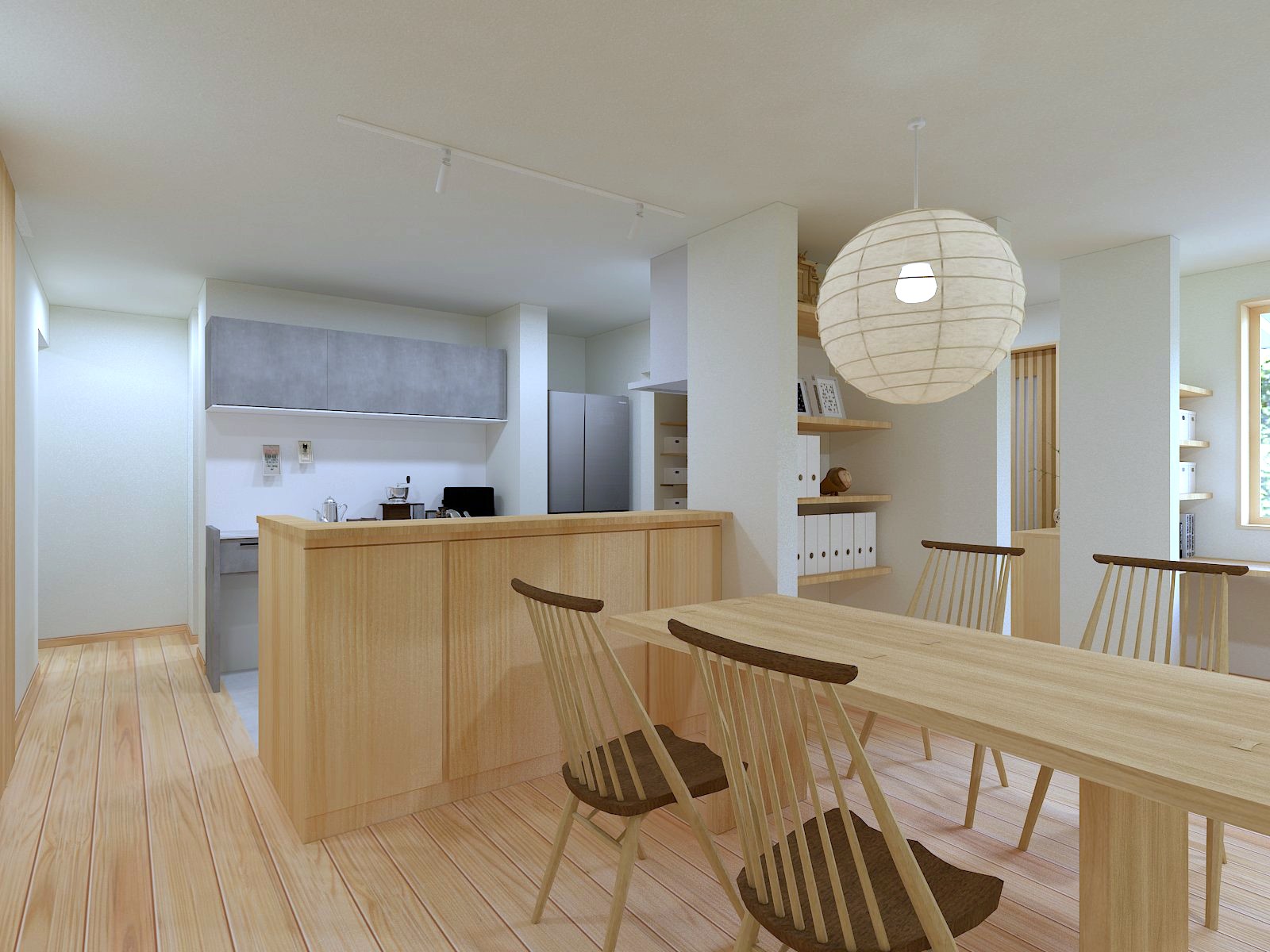 ダイニング側には棚を設置して日用品を収納することで、