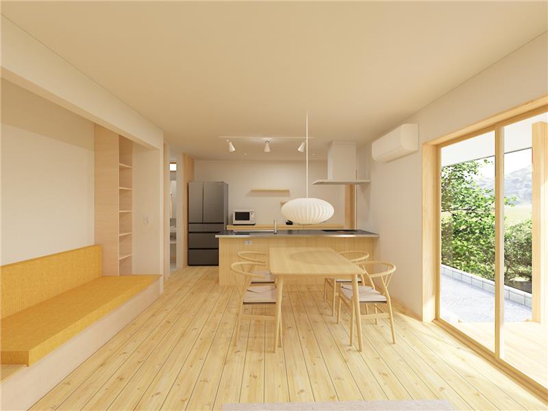 ナチュラルは雰囲気をご希望でしたので、無垢の木を使用した心地よい住まいをご提案させていただきました。造作ソファでくつろぎながら、ダイニングの家族との団らんもできるゆったりとしたLDKは、あかりをしっかりと取り入れた暖かい空間となりました。