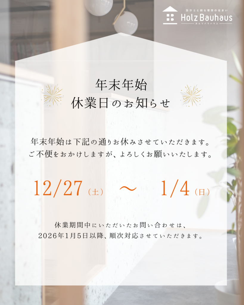 なお、12月27日(土)、28日(日)は休業期間内ですが「ゆるやかに繋がる、三世代のための家事ラクな住まい」新築完成見学会を実施いたします。