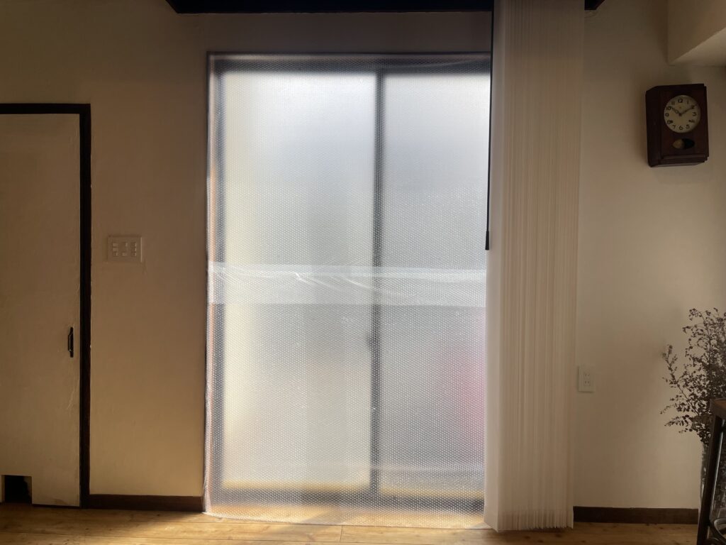 使用したのは、気泡入りのビニールシート、気泡緩衝材です。また結露による窓枠や床の劣化を防ぐための結露吸水テープなども使用しました。