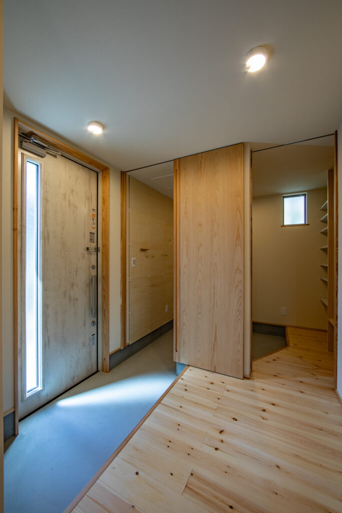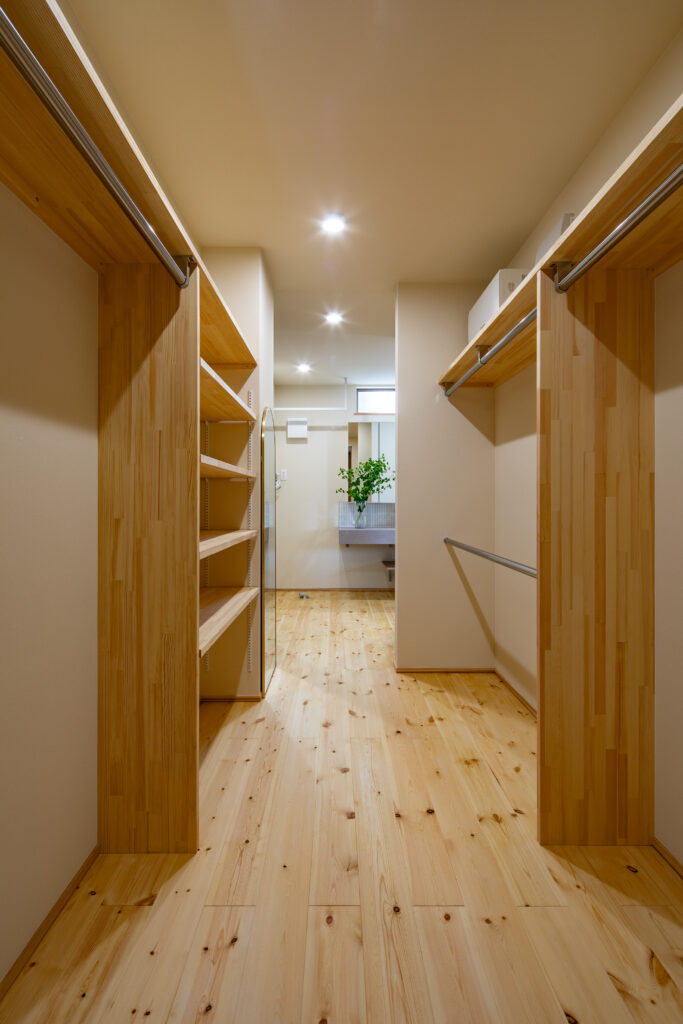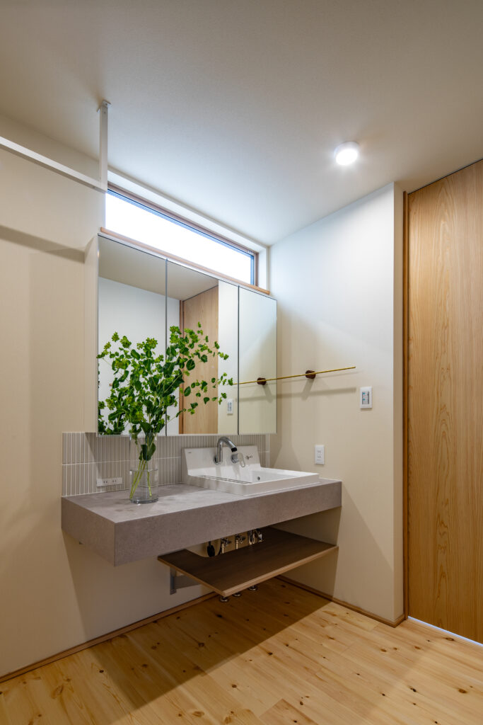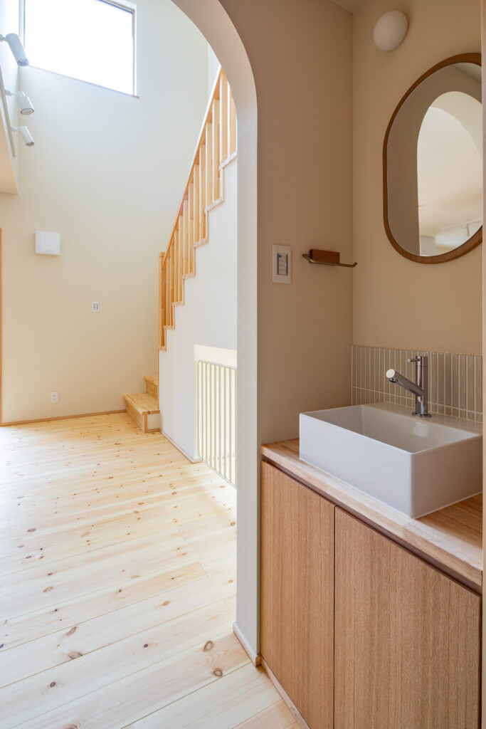 玄関から収納、洗面、リビングへとつながる動線を整えることで、日々の動きが自然とスムーズになるよう設計しました。