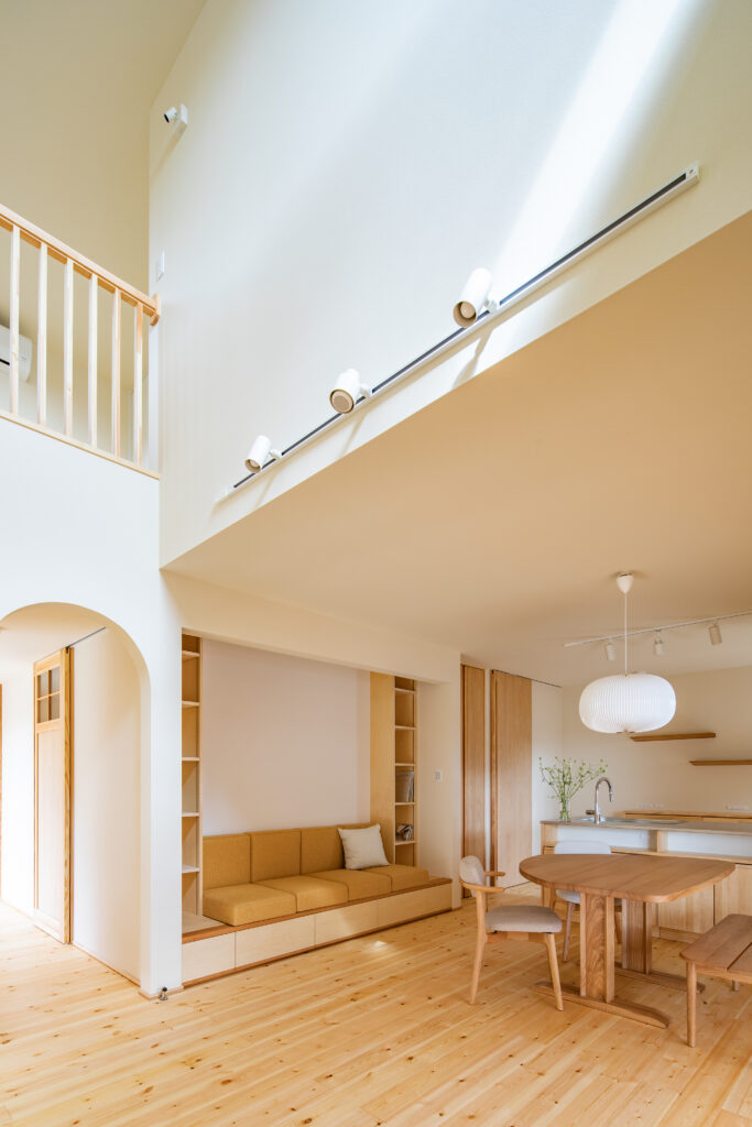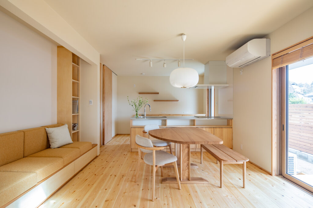 無垢の床と造作のベンチがやさしく調和し、家族が自然と集まる居場所をつくります。