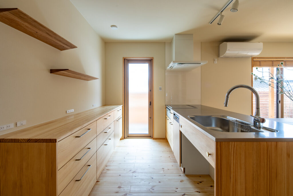 勝手口へとつながる動線も備え、日々の家事が無理なく整う、機能性と心地よさを兼ね備えたキッチンです。