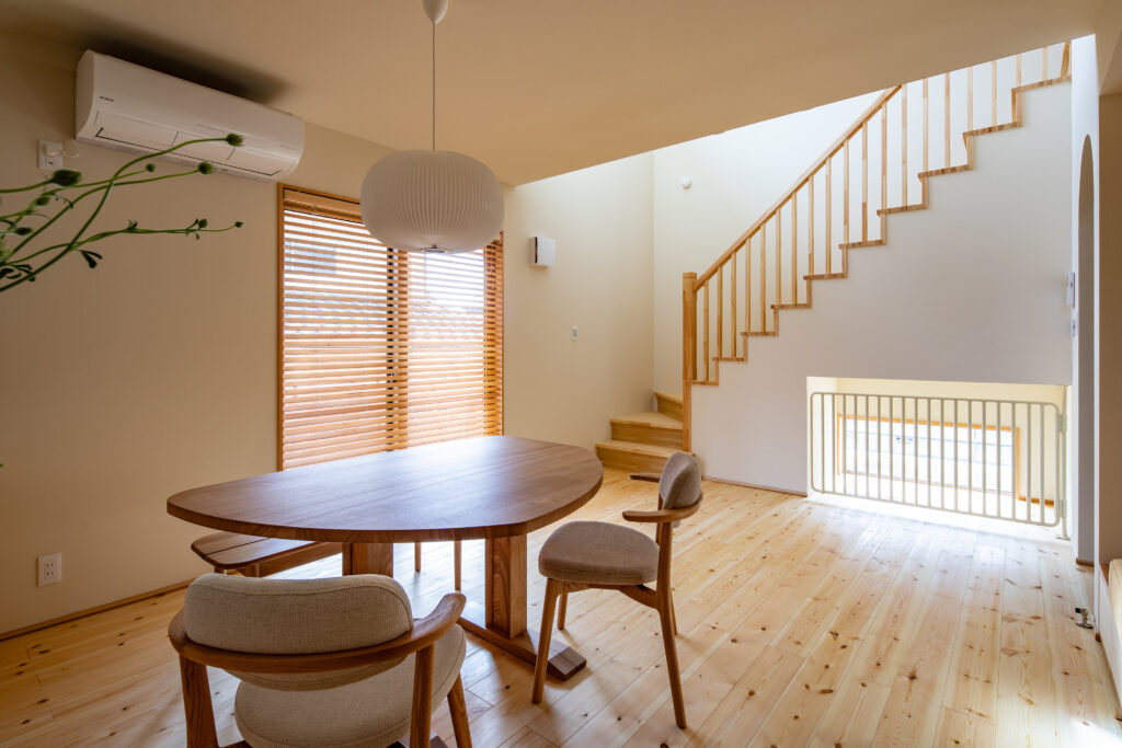 無垢の床とやわらかな光に包まれた、心地よいダイニング空間。