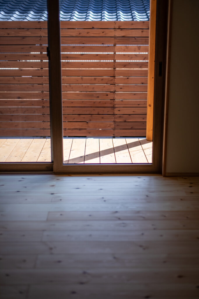 室内とつながるウッドデッキは、外の気配を感じながらも落ち着いて過ごせる半外の空間。