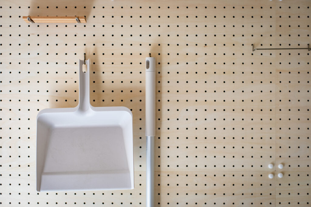 フックや棚の位置を自由に変えられるため、掃除道具やアウトドア用品などを使いやすく整理できます。