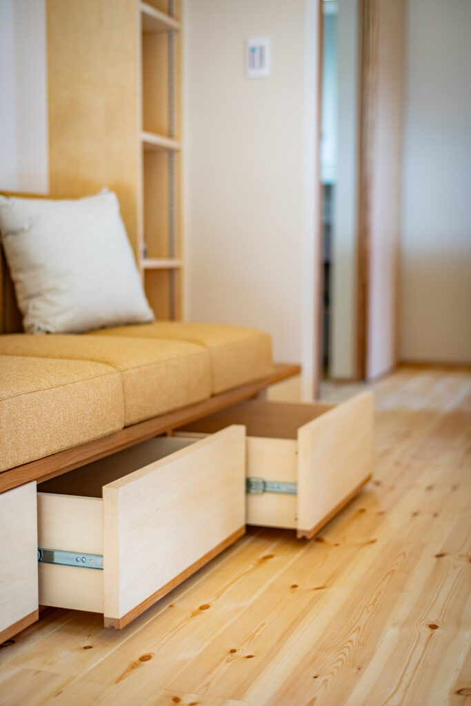 座面下には引き出し収納を設け、日用品やリビングで使う細かな物をすっきり整理できます。